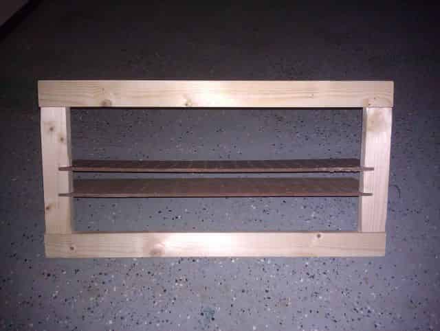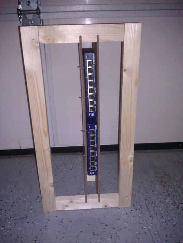 Today, we assembled the framing of the equipment rack and then we cut some notched pegboard that was six inches deep and ran the length of the equipment rack. The purposes of the notches in the pegboard are to help hold the shelf in place. At the back of the pegboard, we screwed in a couple stubby pieces to keep the shelves’ shape and to keep them study. Because the two pegboard shelves are installed within an inch of each other, I decided that we’d go ahead and mount the Netgear switches to one of the shelves.