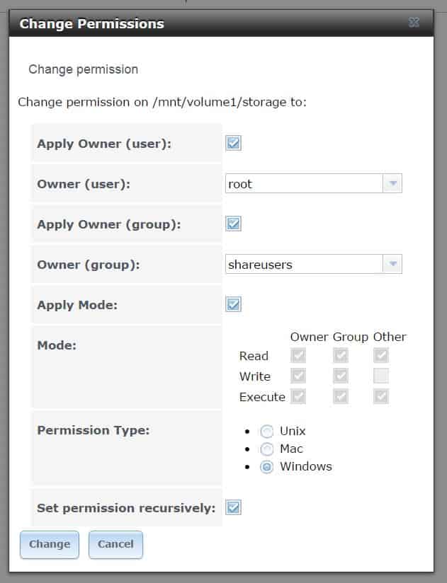 Because I skipped over the permissions sub-step in the Initial Wizard, the next thing I did was to create a group named “shareusers” and then I created a user named “brian”, which I added to the “shareusers” group and made sure the user’s password matched what I was using on my local desktop (the passwords must agree, since I’m not using Directory Services). After that I went into the permissions (Storage -> Volumes -> expanded down to /mnt/volume1/storage) and made the Owner (group) the “shareusers” group that I created above.