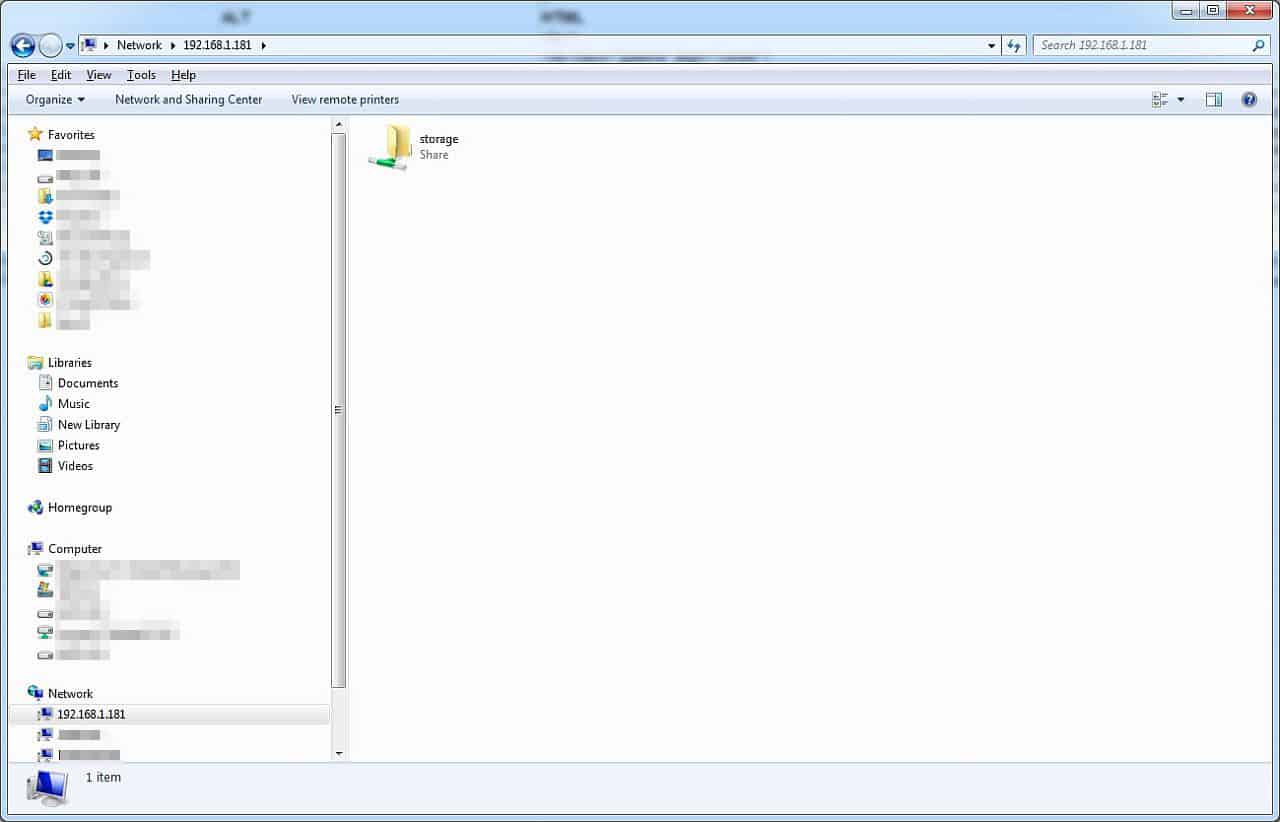 Having completed all of that, I browsed to the machine by its IP address from my desktop and verified that I could see the share named storage, that I could browse its contents, and finally that I could copy files to/from the share.