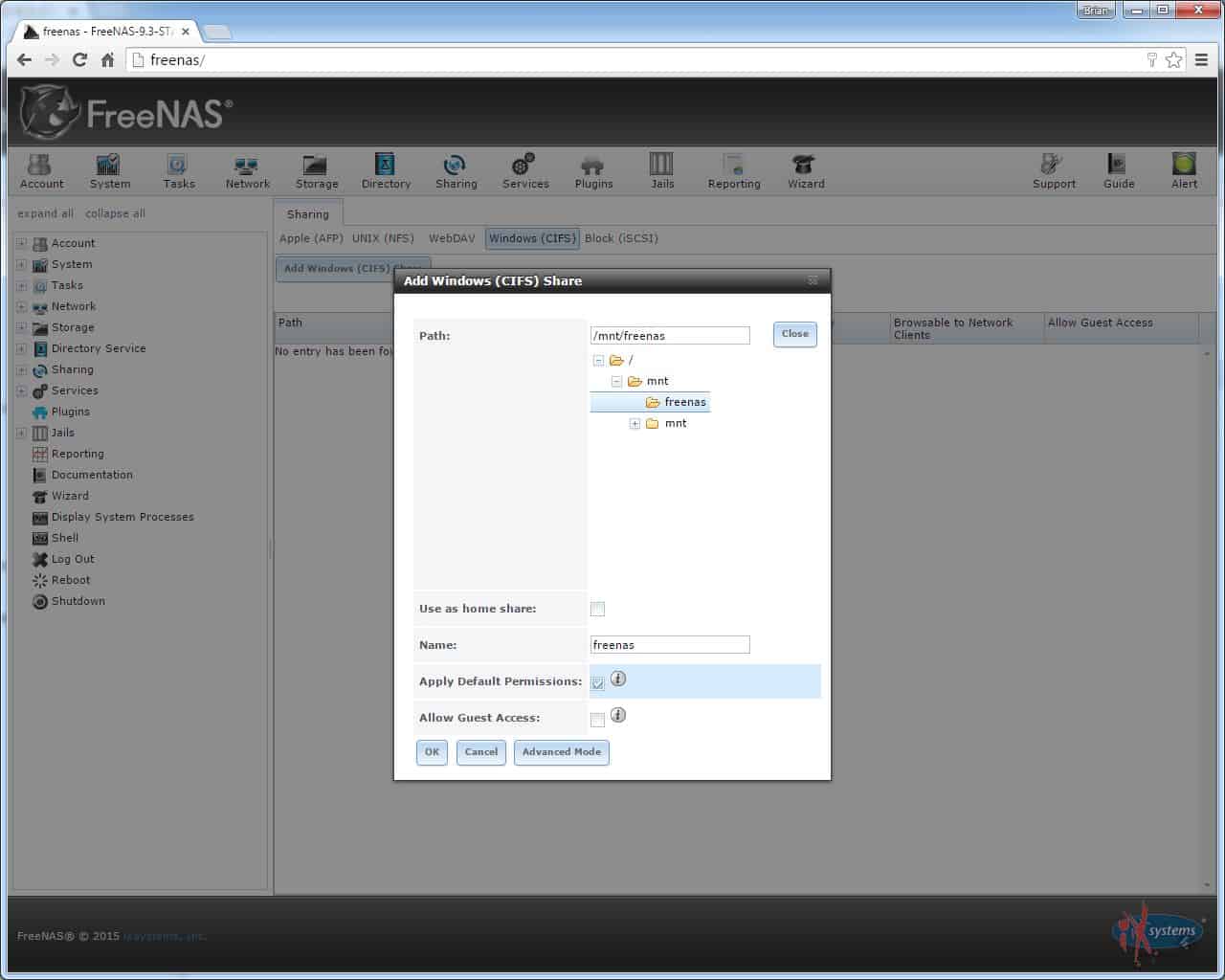 After the setup was complete, I went ahead and deleted the FreeNAS volume (zpool) that was imported during the initial setup. A brand new FreeNAS volume (zpool) was created from scratch, all 5 of the 2TB drives were added to it, and I selected RAID-Z2. I created a group called “cifs”, a user (that matched my local credentials), added my new user to the cifs group, changed the file permissions so that the cifs group could make changes, and then created a CIFS share to point at the root of the FreeNAS volume.