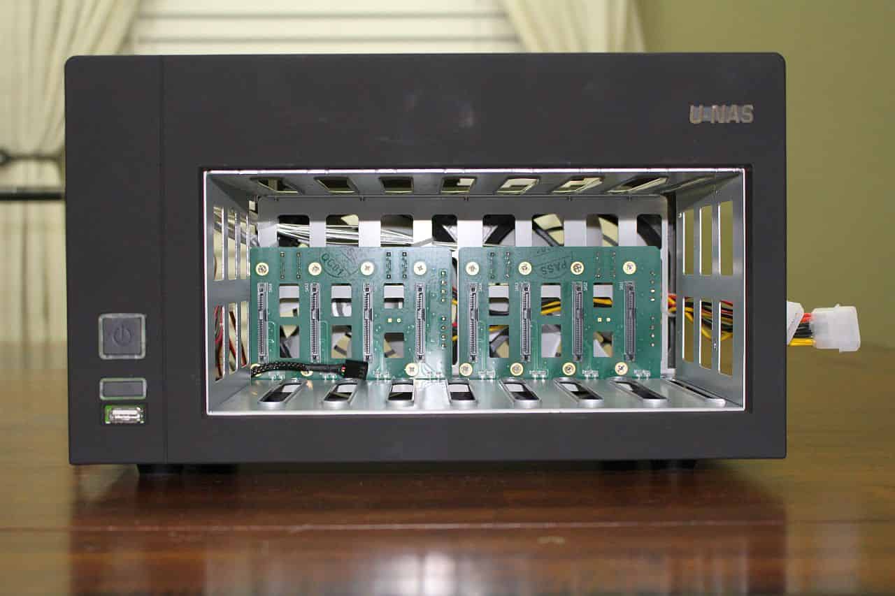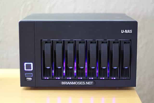 Specifically, I was asked about the U-NAS NSC-400, which I think is a little small. But I was intrigued. If there were bigger version(s) of that same case I thought it’d be a very temping option to my prior favorite cases. I found that as I was hoping an 8-drive version existed, the U-NAS NSC-800 (specs). U-NAS built a great case for their own NAS devices and then wisely decided to sell the same case to others who wanted to build their own DIY NAS. Its most important feature was that it had room for 8 HDDs in removable and hot-swappable drive trays. In addition to that, it has room for a couple 2.5” hard drives. It seemed extremely compact with dimensions of 316mm x 254mm x 180mm and it claimed “Ultra Quiet Operation.”