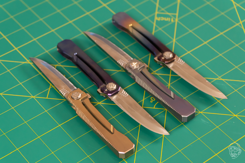 As an option, each of the handles on my orders had been anodized in different colors: a darker blue, a light blue, gold, and a prismatic rainbow–each of the colors looked fantastic, and from what I’ve also seen on Hathaway Knives’ Instagram account, the bare titanium looked equally sharp.