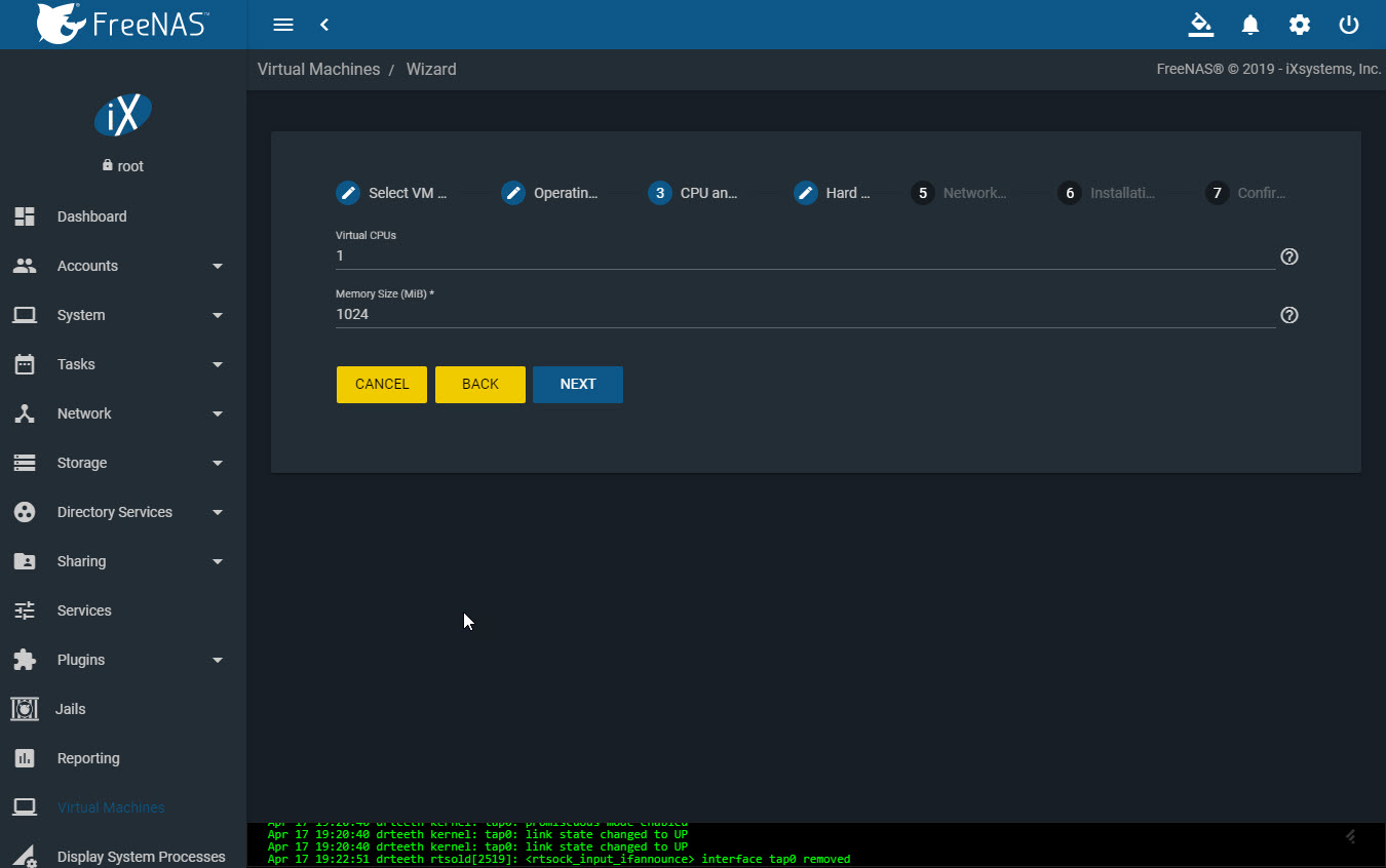 On my DIY NAS, I logged into the FreeNAS interface and created a Virtual machine. I allocated the VM with a single Virtual CPU, 512MB of RAM, created a new 64GB disk image, pointed it to the Ubuntu 20.04 ISO I picked and, started the virtual machine up.