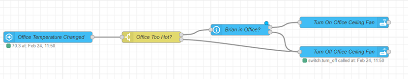 Incorporating presence condition into the automation was a snap! I wound up adding a node to that flow to check which room ESPresense detected my watch was in. In order for the fan to get turned on in my office, two conditions would now need to be met: the temperature would need to be over 75 degrees and my watch would need to be nearest to the ESPresense base station in my office.